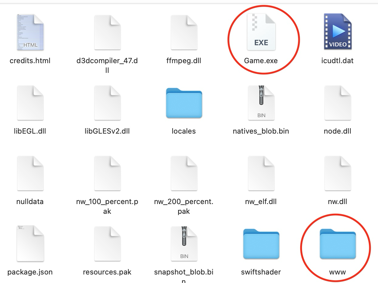 RPGMV游戏结构是这样的。一般来说只要文件夹内有这个www文件夹,或者index.html文件,和Game.ext都是可运行的RPG MV/MZ游戏。